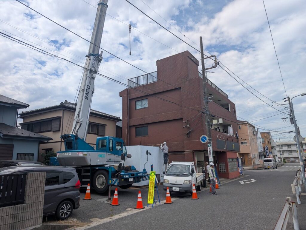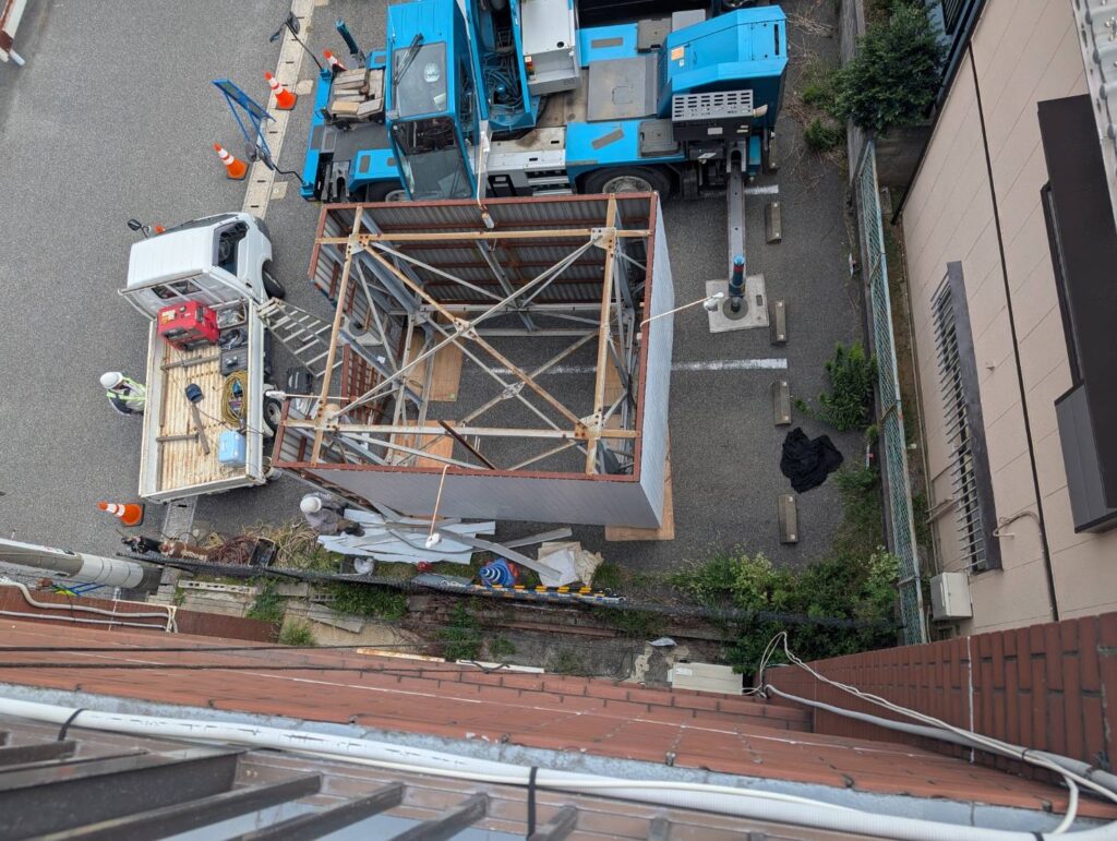 工事 塔屋解体工事 こんにちは。現場がたくさん入っていてすっかり秋になってしまいました。今年中にはHPも完成しないと!結局1年かかってしまいます。今回はビルの塔屋の解体と解体後は屋上防水です。 解体前 解体中 この屋上の白い塔屋部分を切り落として、20トンラフタークレーンで吊り上げて下に下ろす作業です。 駐車場のお車の持ち主様のご協力や、ガードマンの手配もあり、大掛かりな工事でした。 解体中 解体後 無事撤去できました。 安全に工事が終わり感謝です。 投稿者: mrs110工事 棟積み直し工事 給湯器交換