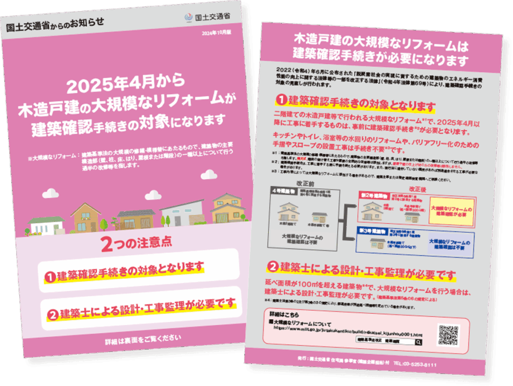 2025年4月の建築基準法改正により、大規模なリフォームでは建築確認申請が必要になります。これは、これまで不要だった木造2階建て住宅などで、主要構造部(壁、柱、床、屋根、階段)の半分以上を修繕・模様替えする工事が対象です。改正は耐震性能と省エネ性能の向上を目的としています。