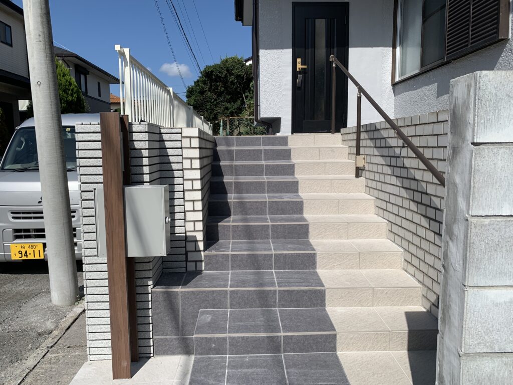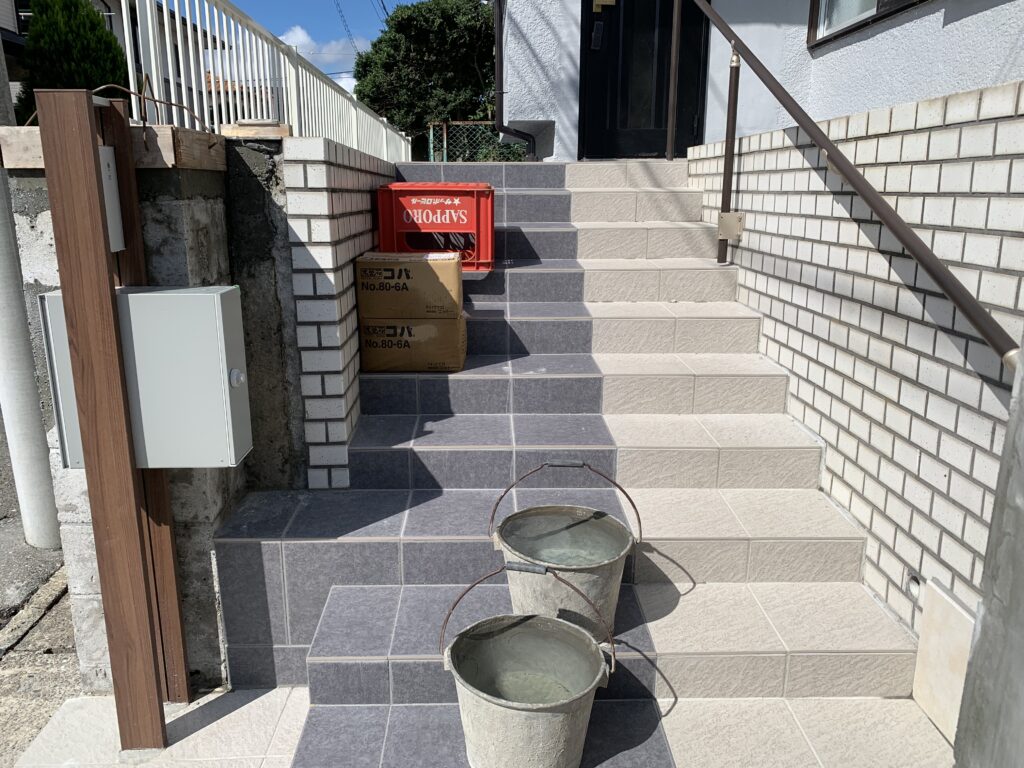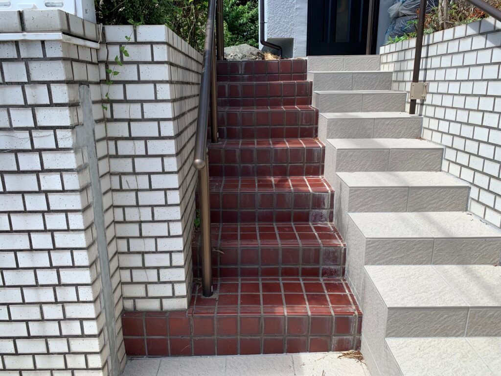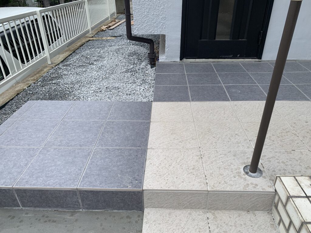 センターから階段の位置高さがが違い、赤いタイルの方は雨の日に滑る素材です・階段の高さを合わせ、タイルを貼ります。主流の300角タイルをはりました。高級感が出ています。