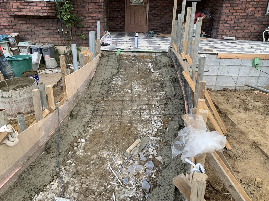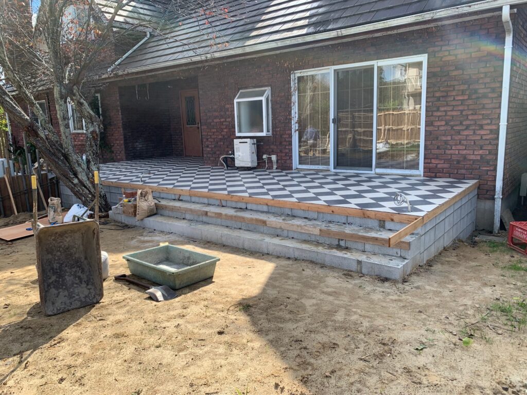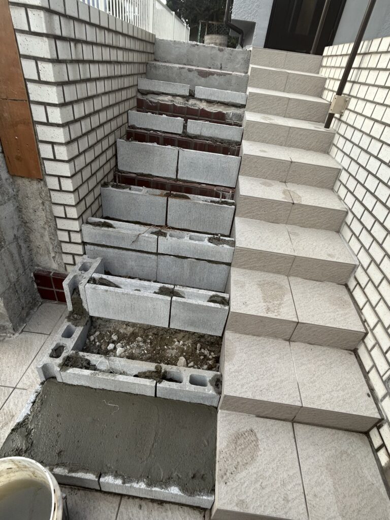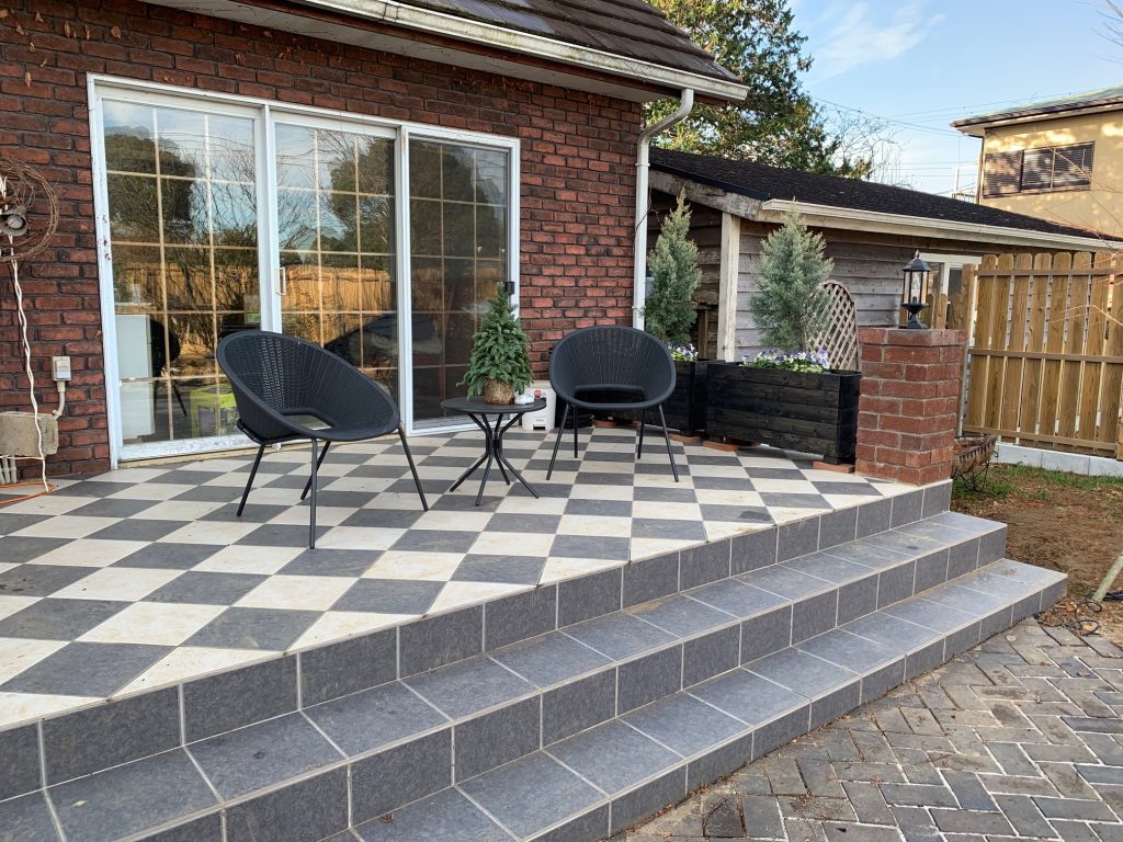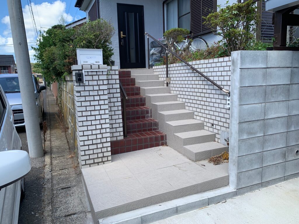 センターから階段の位置高さがが違い、赤いタイルの方は雨の日に滑る素材です・階段の高さを合わせ、タイルを貼ります。主流の300角タイルをはりました。高級感が出ています。