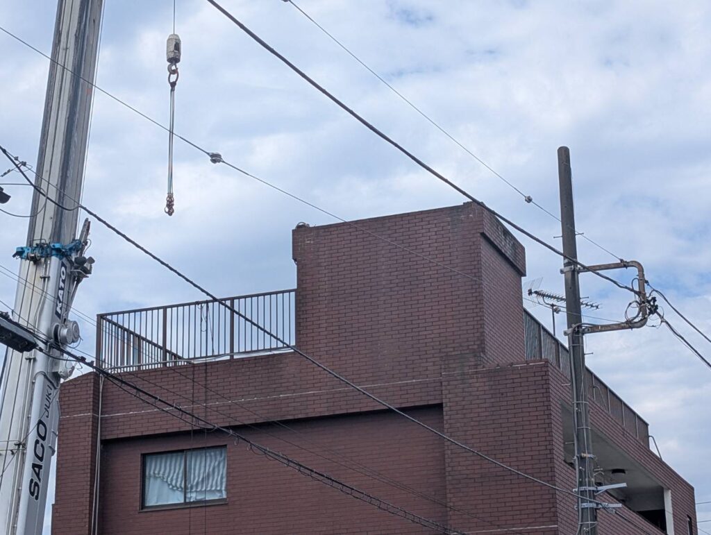 塔屋支柱切断後 20トンラフタークレーン吊り下げおろし解体