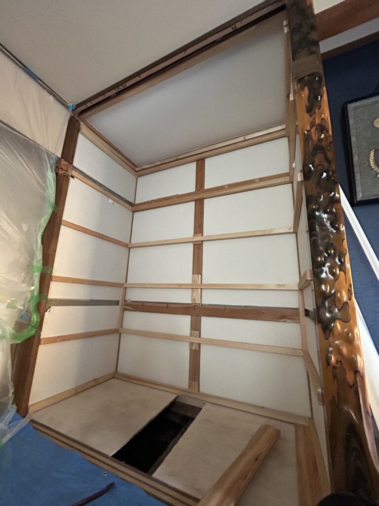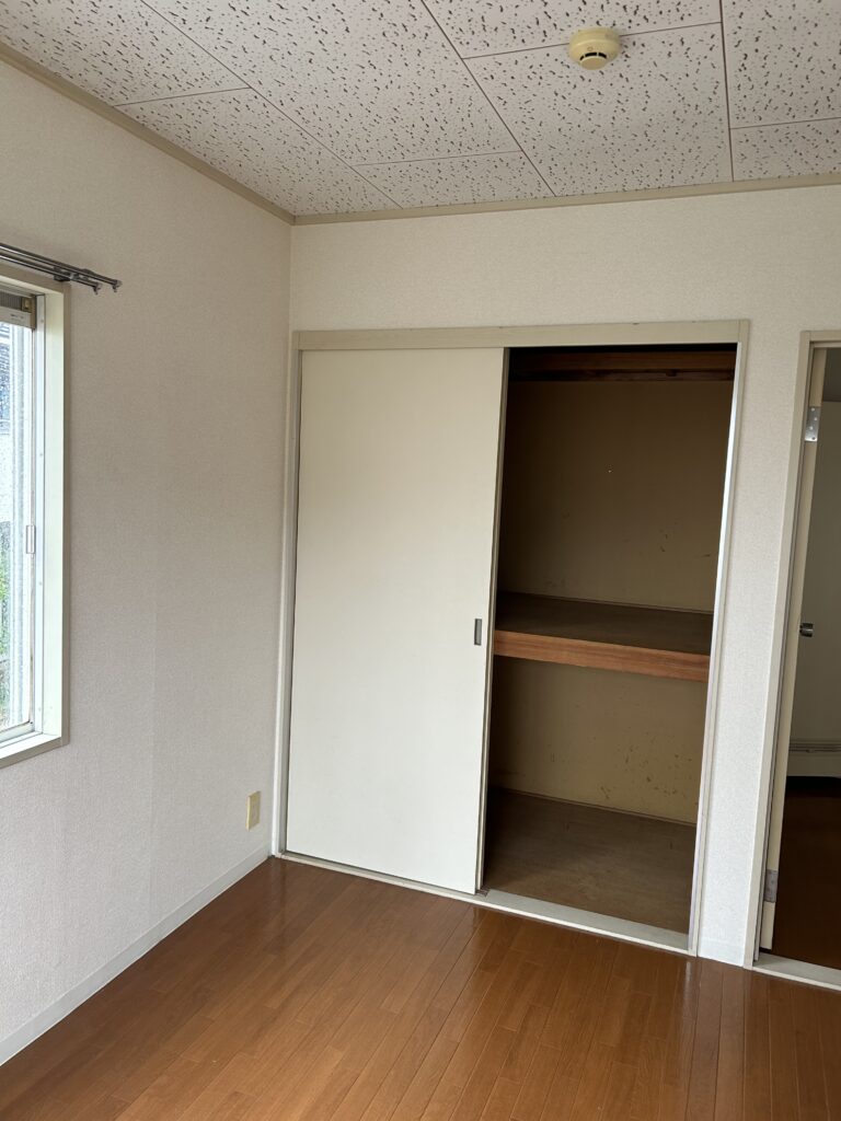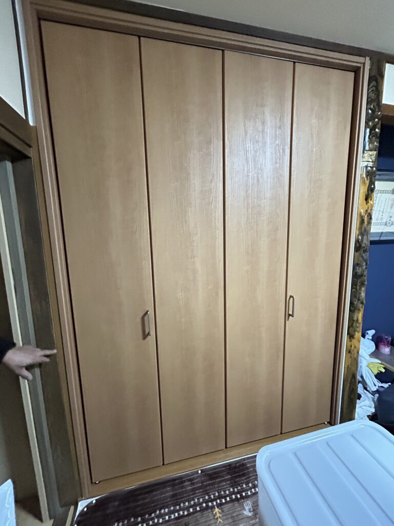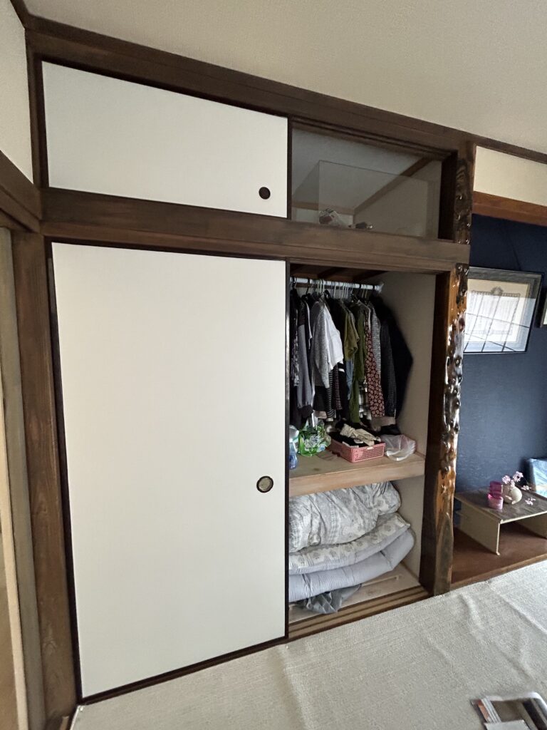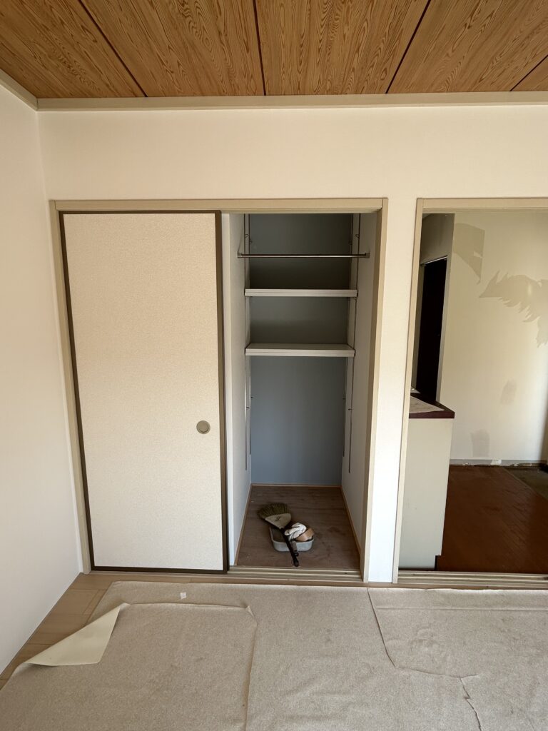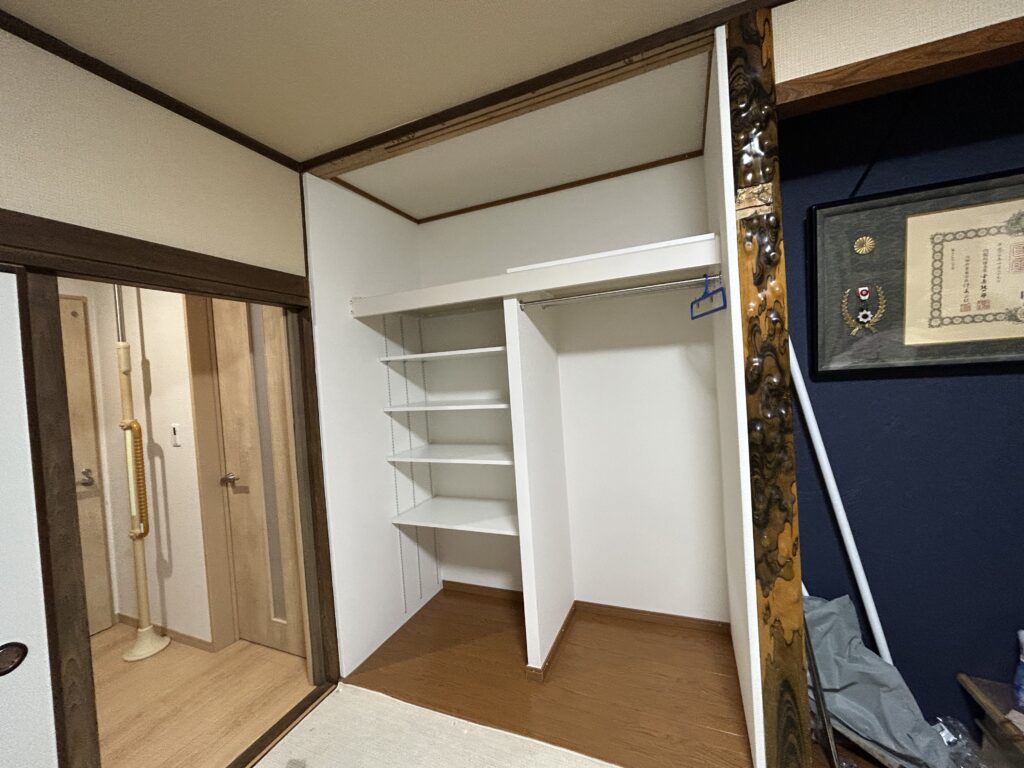 大工・木工事 畳からフローリング 賃貸物件リフォーム ダイケン フローリング ハピアオトユカ 施工前 施工後 押入れからクローゼット 賃貸物件リフォーム 後部クロス アクセントカラー 施工前 施工後 施工後 N様邸 押入からからクロゼット(天袋部分解体) 折れ戸 LIXIL ラシッサS ケーシング枠 施工前 解体 下地 枕棚・棚・クロスはり 折れ戸取付 完成 防蟻・害虫駆除工事 設備・水廻り工事